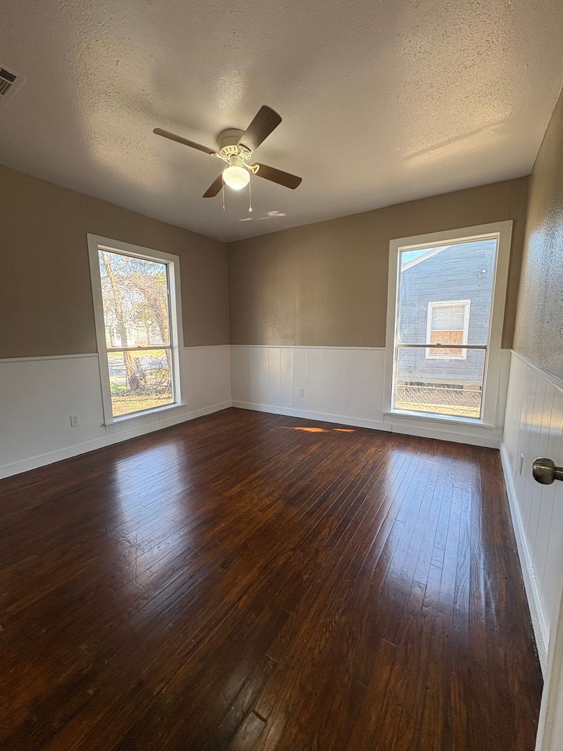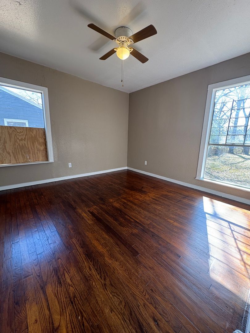 This wonderful house has beautiful hardwood floors throughout living areas with new vinyl plank in the kitchen and bathroom. Ceiling fans in bedrooms and living room. Eat-in kitchen. Laundry room is located in hallway. New paint throughout! House is heated/cooled with window ACs & wall heaters. Section 8 accepted.